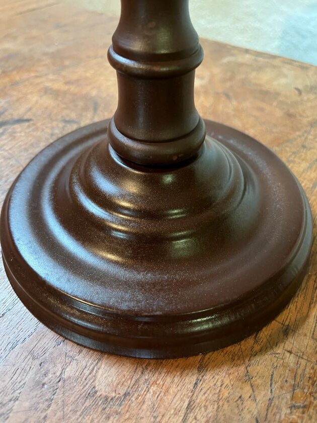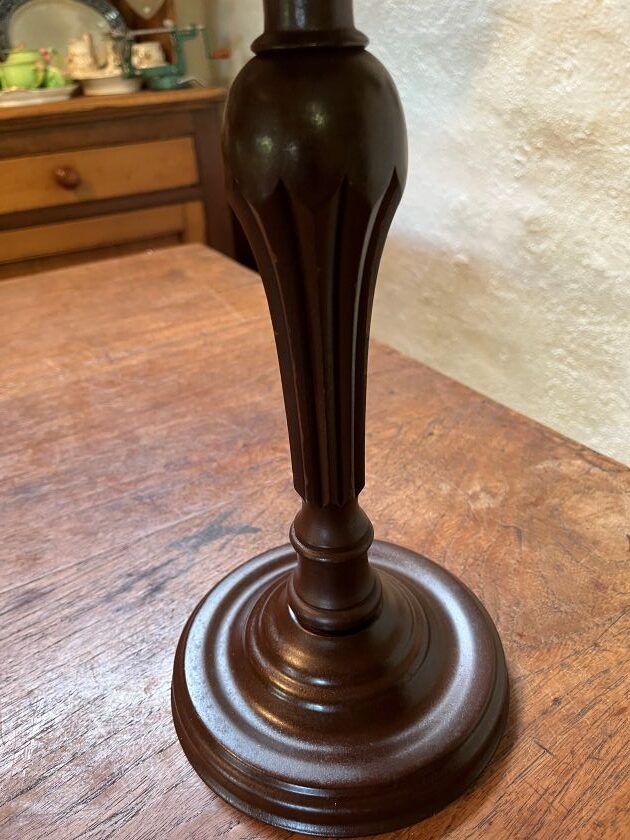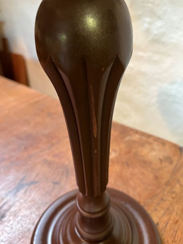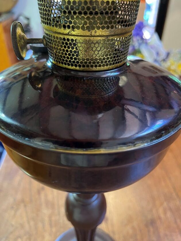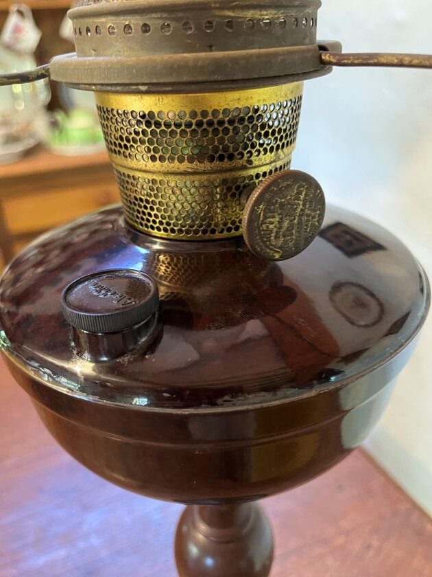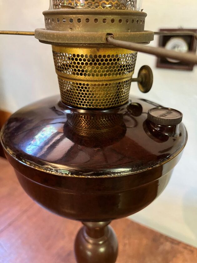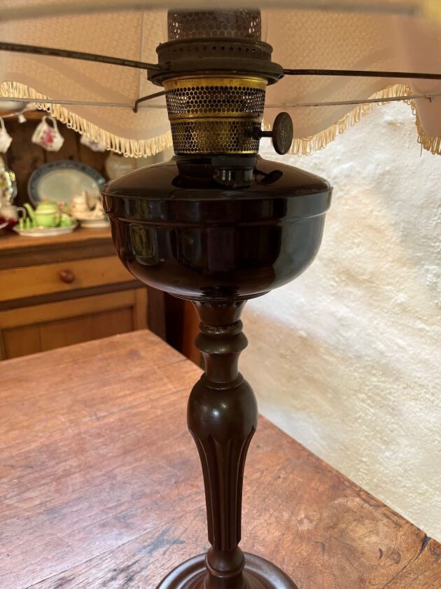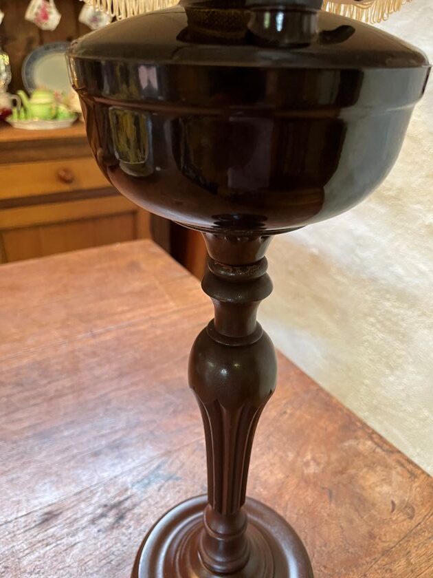 Aladdin oil lamp with a metal base, turned and carved wooden pedestal, brown bakelite font. There is some wear to both font and pedestal as shown in photos and reflected in price.