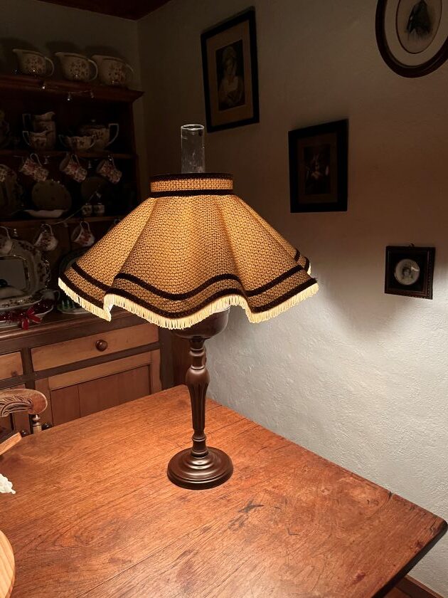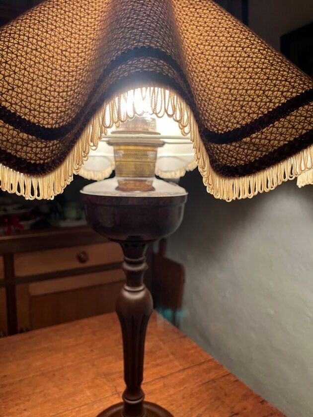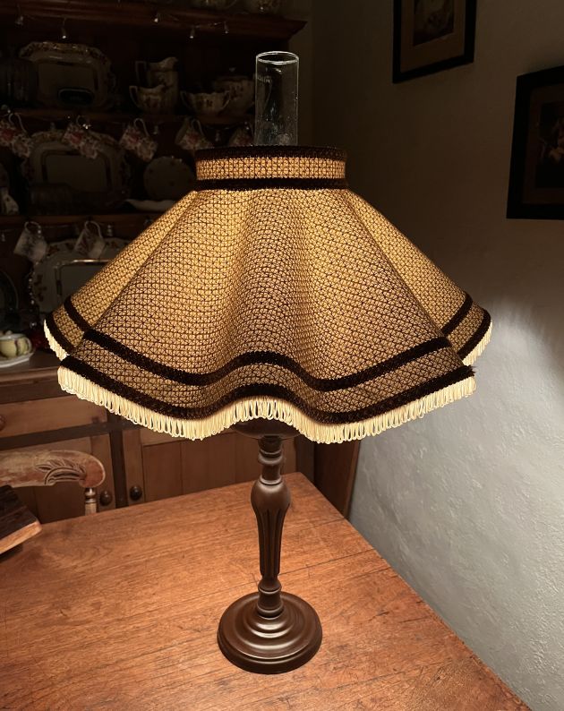 Has an Aladdin Chicago Nu Type B burner, marked Aladdin chimney, new wick and unusual large wavy non Aladdin fabric shade. circa mid to late 1940’s.