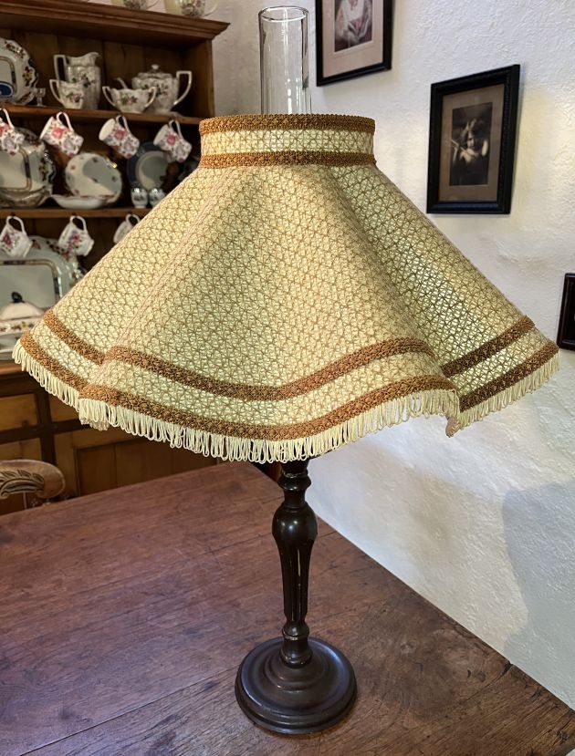 Aladdin oil lamp with unusual fabric shade, Nu type B burner, Aladdin marked chimney, new wick