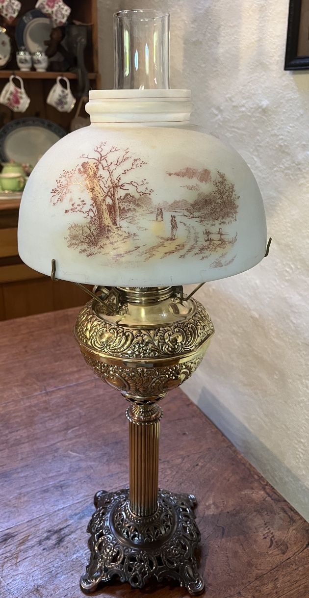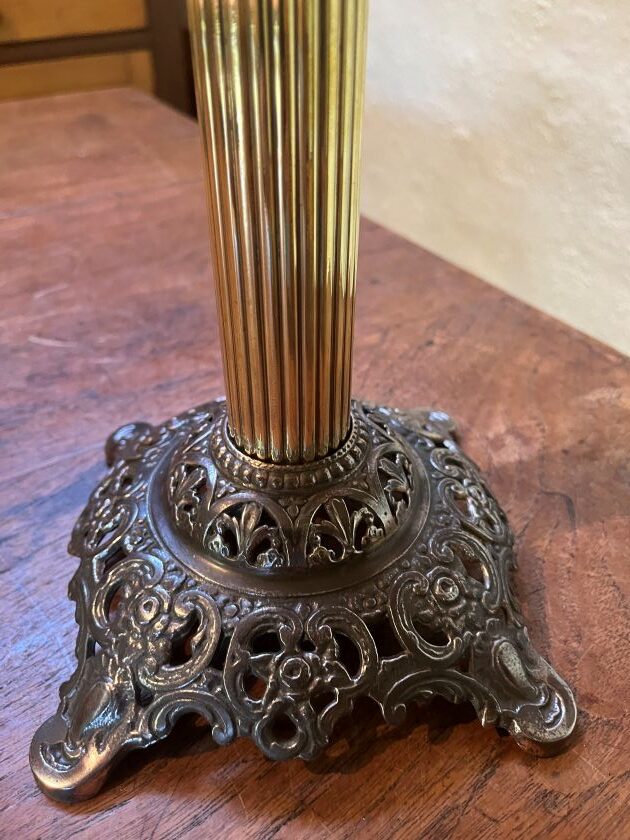 American ‘Juno’ Banquet Oil Lamp. Brass font and column with pierced cast base and original Miller shade, new wick & chimney.