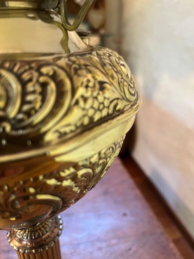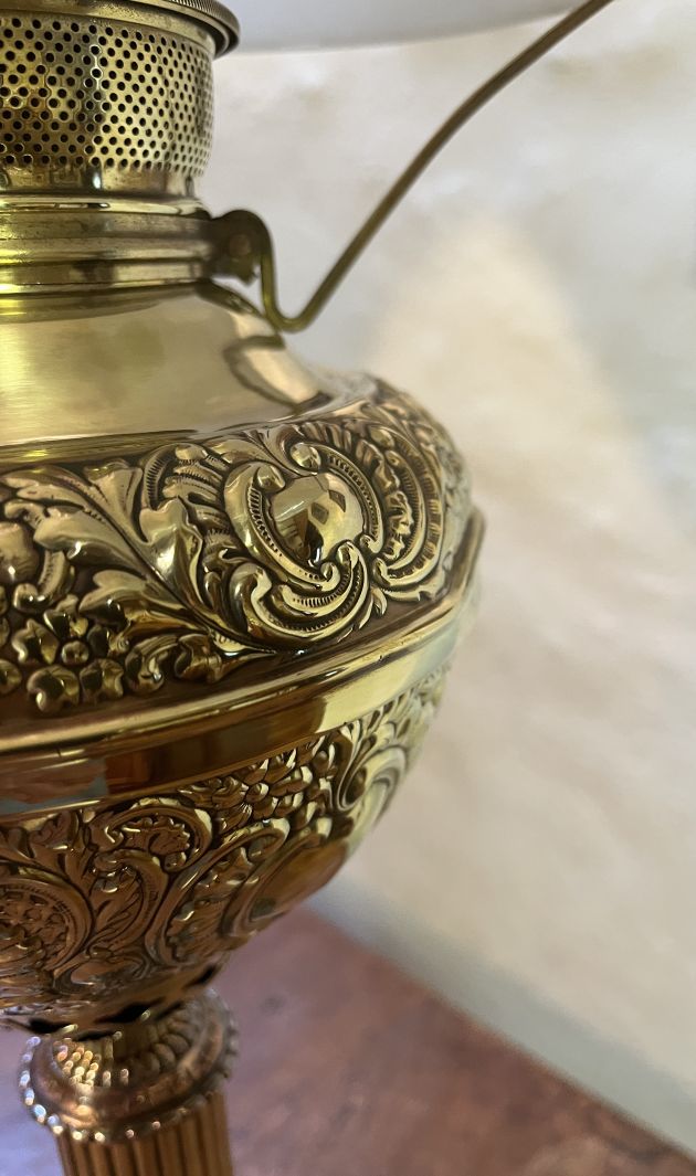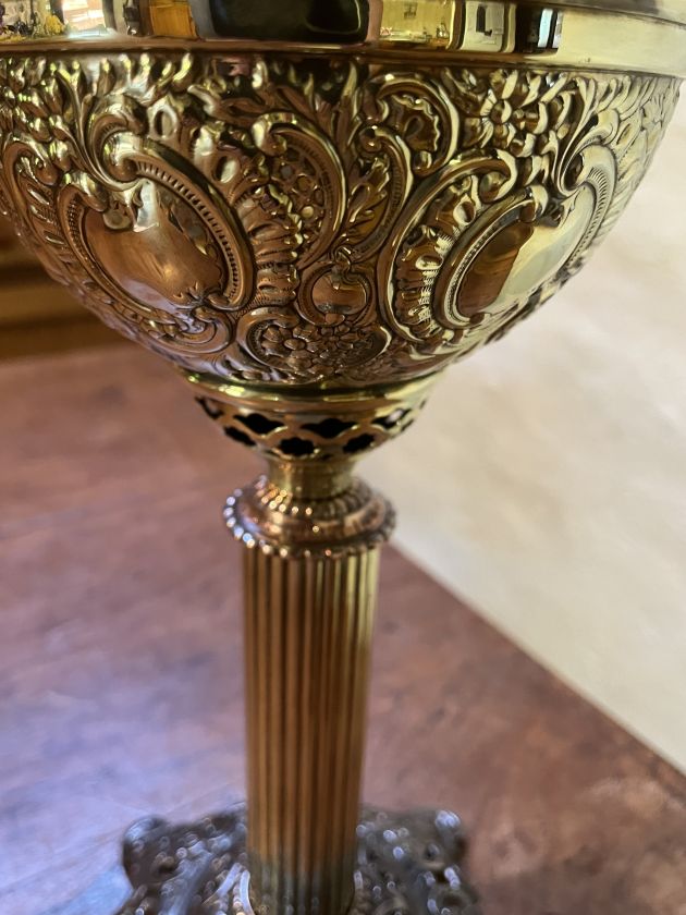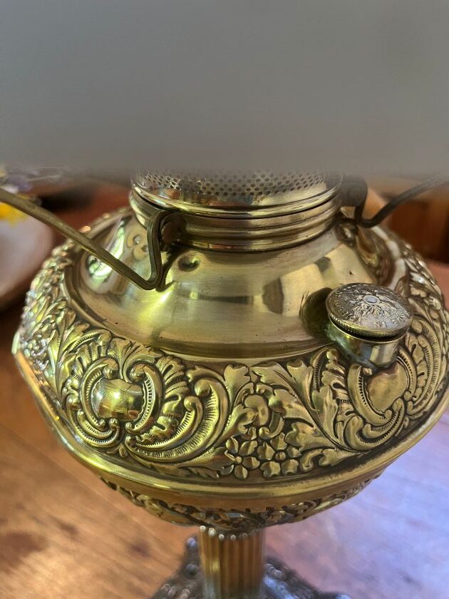 American ‘Juno’ Banquet Oil Lamp circa 1895. Brass font and column with pierced cast base and working wind-up burner.