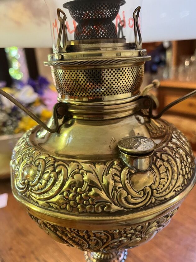This American ‘Juno” banquet oil lamp has been fully restored and burns well, is 25″ in height to top of chimney and weighs 2.3kg