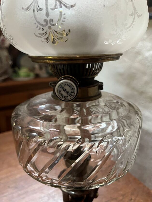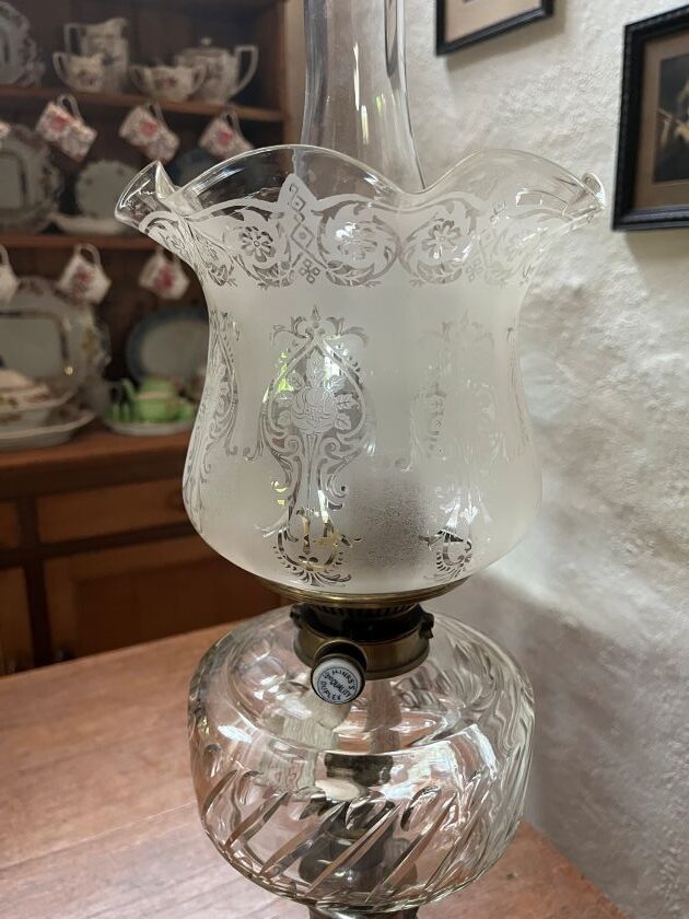 Beautiful crystal cut glass font and Hinks duplex burner with vintage tulip glass shade. New Duplex chimney and wicks.