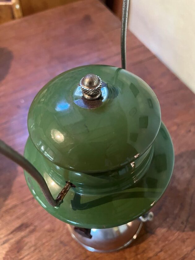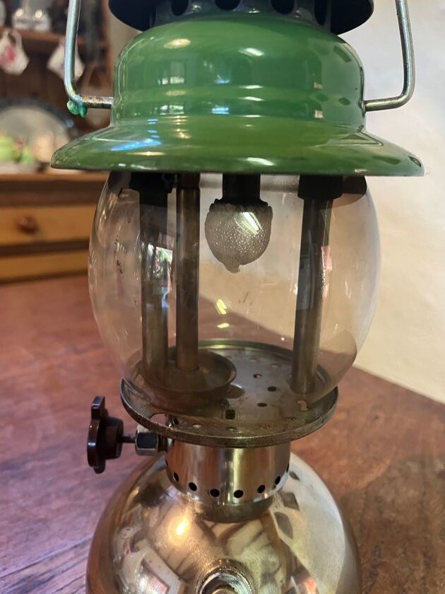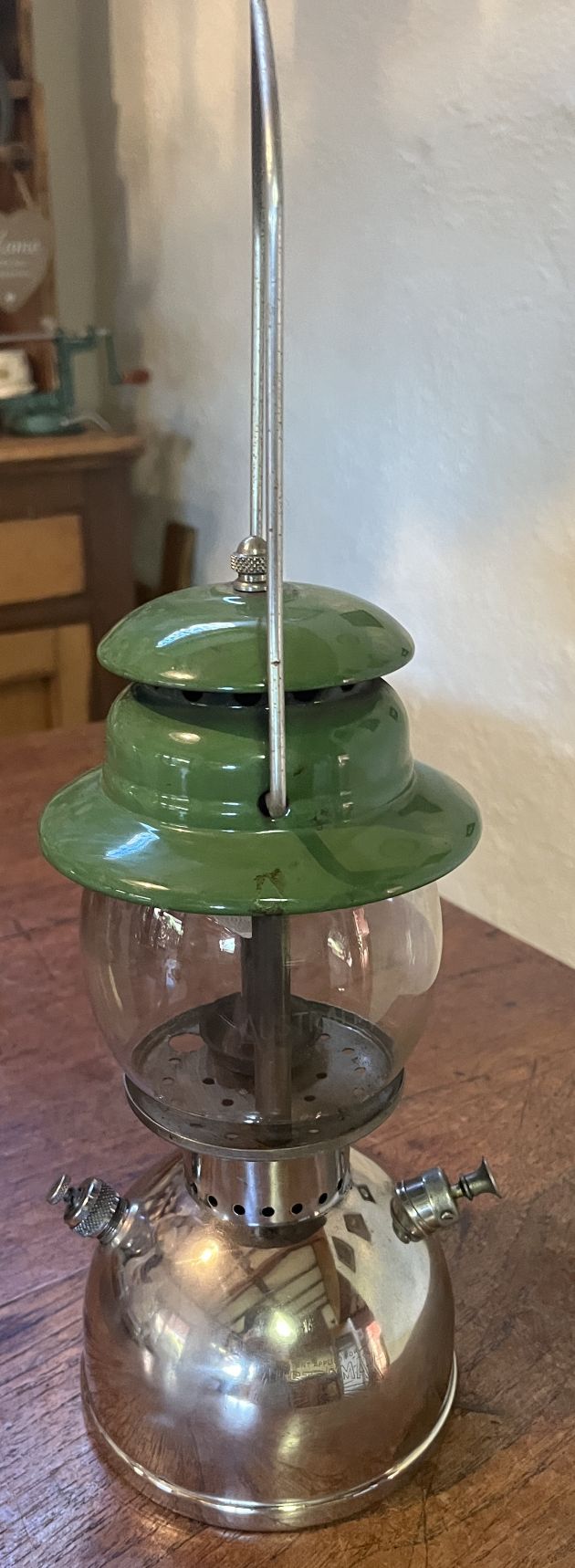 1960’s Kerosene pressure lamp, Australian made, nickel plating in fair condition as is green hood.