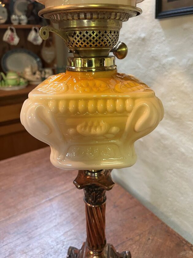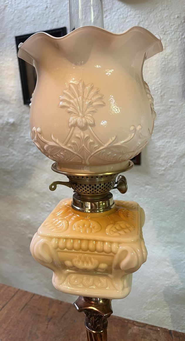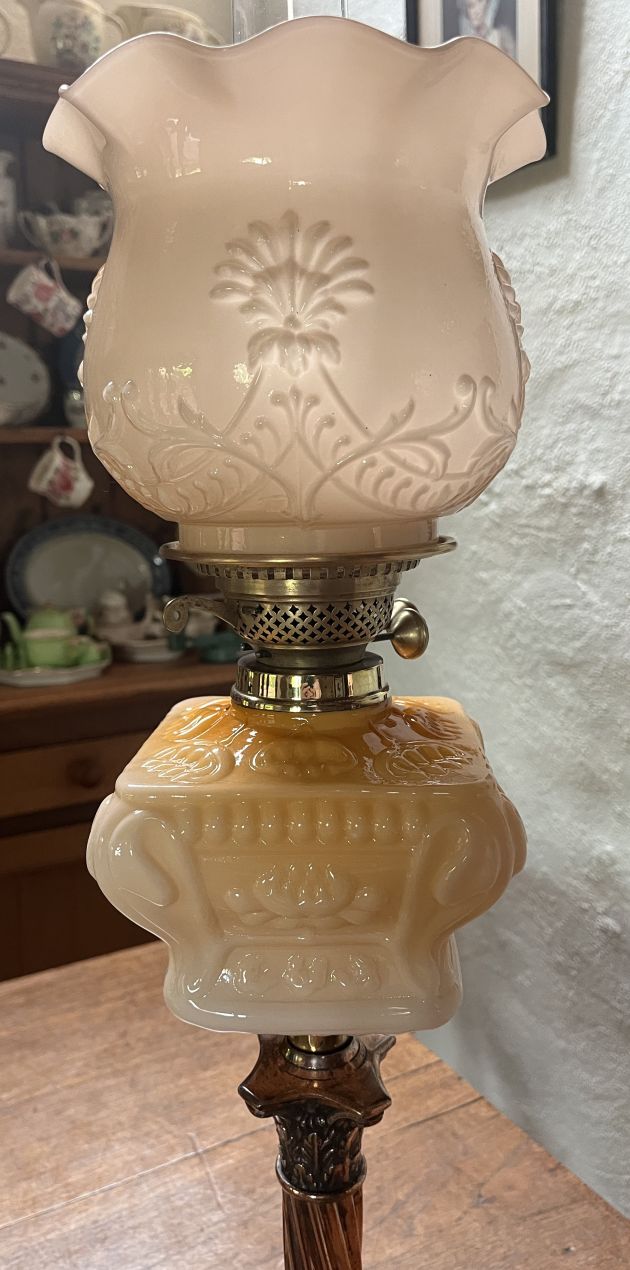 Victorian Banquet oil lamp with an Amber Blush graduating from very pale pink/amber to deep amber embossed glazed font with floral motifs.
