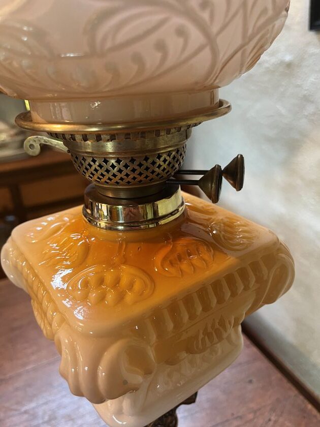 The banquet lamp has a good quality English lever lift duplex burner with ‘duplex’ shown on wick winder wheels, duplex chimney and new wicks.