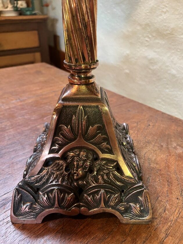 Highlighted bronze cast iron base featuring faces of winged cherubs/putti and acanthus leaf with Rd No. 405487 dating design registration to 1903.