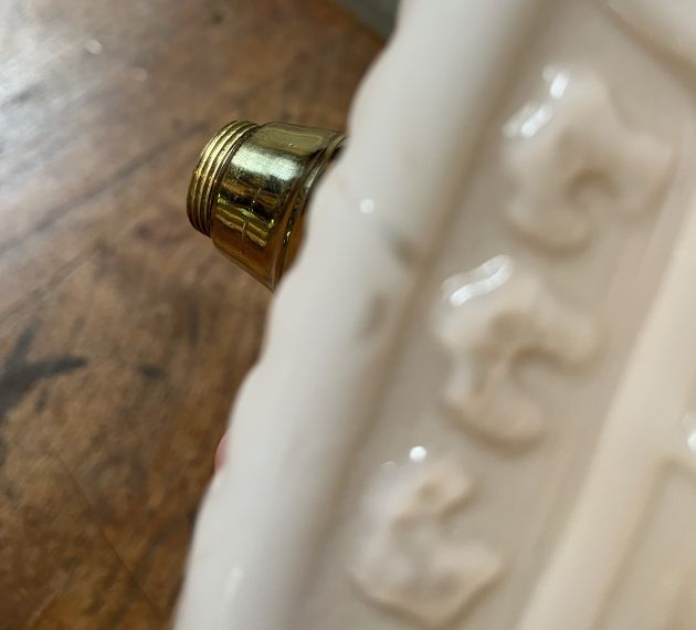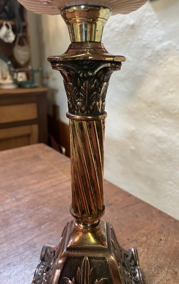 Twisted reeded bronzed column and capital – rare square cased embossed font, please read full description, English duplex burner, embossed vintage shade.