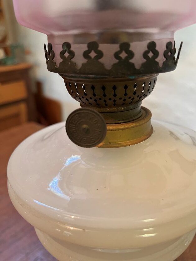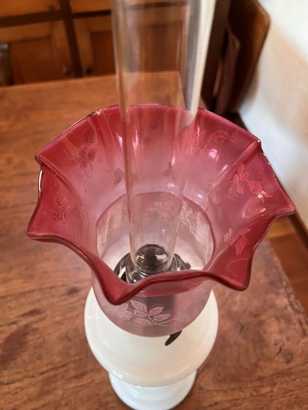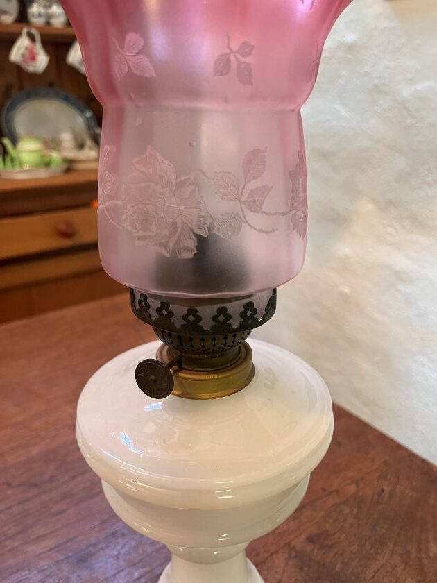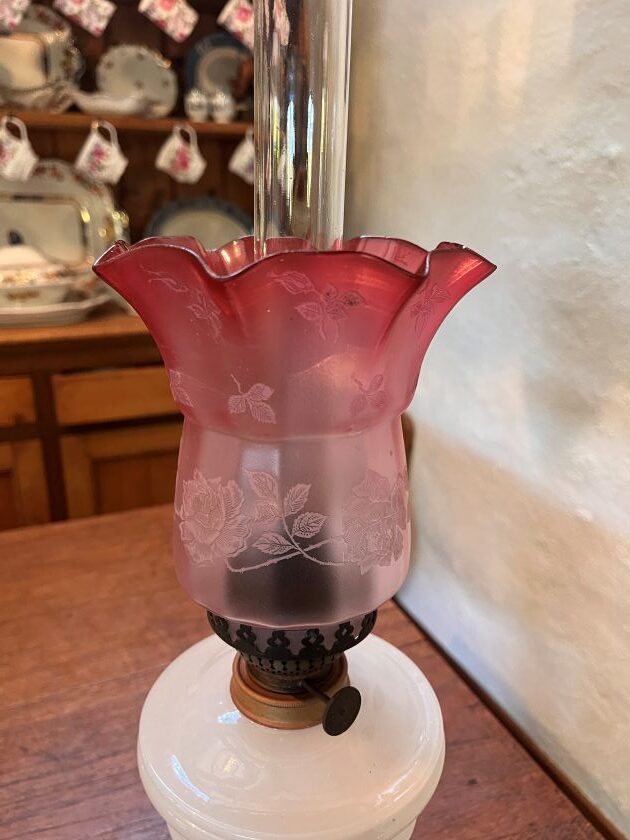 Bismark opal oil lamp with original Brenner burner c1910, new chimney and wick with an original etched cranberry shade.