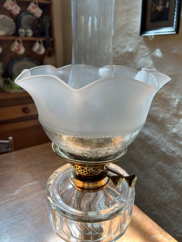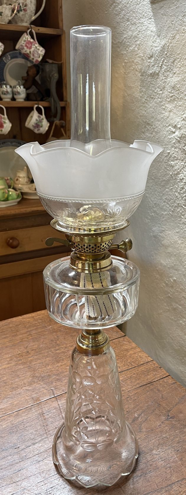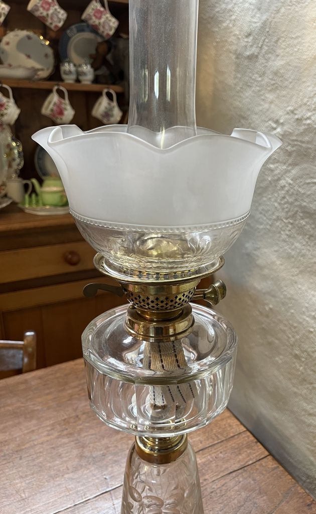 Composite Glass oil lamp, cut glass base of flowers, facet cut crystal glass font, English duplex burner, open tulip glass shade.