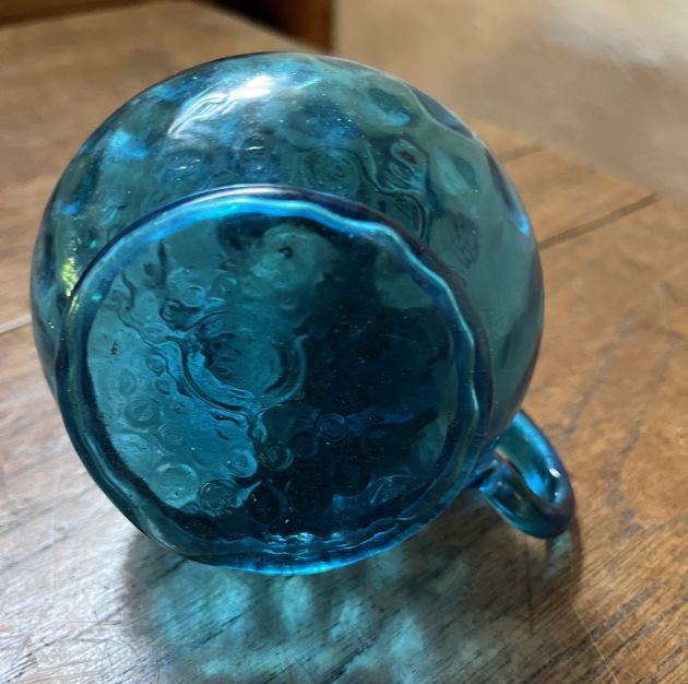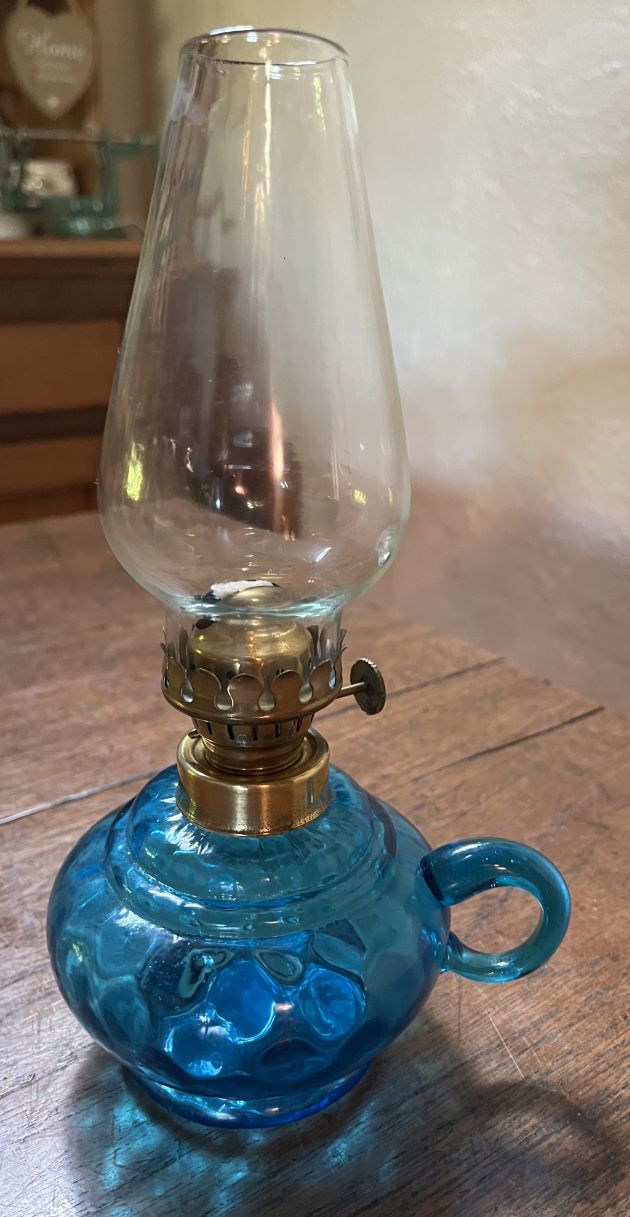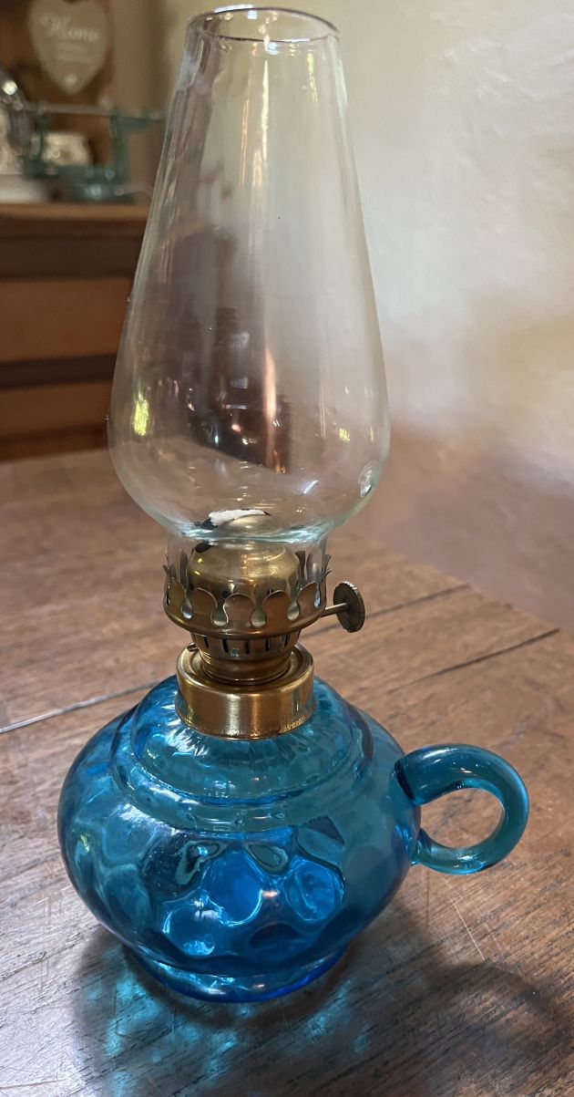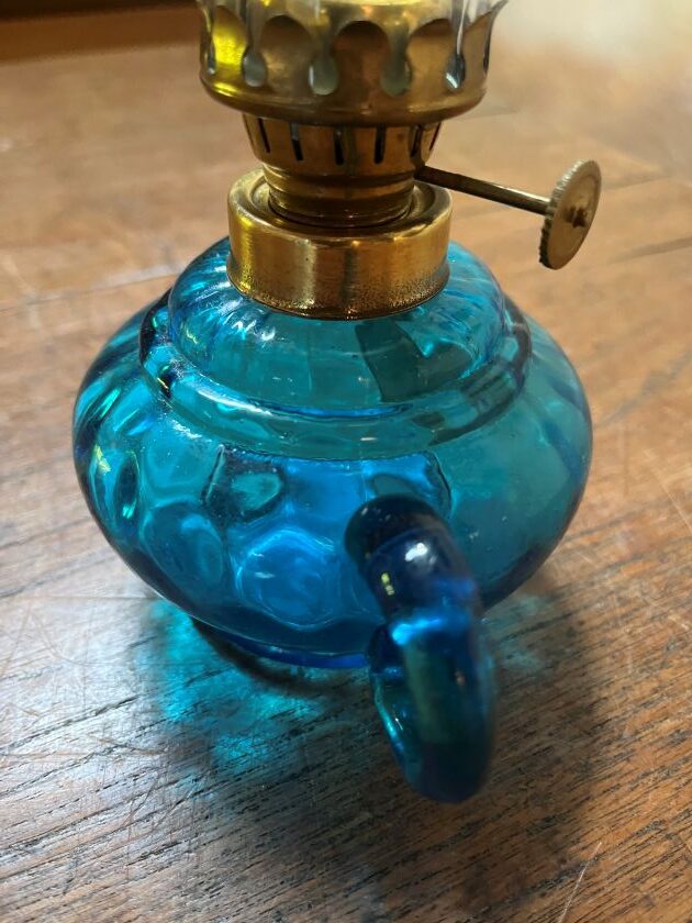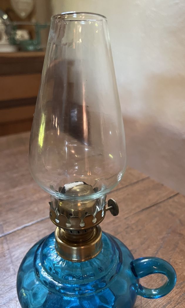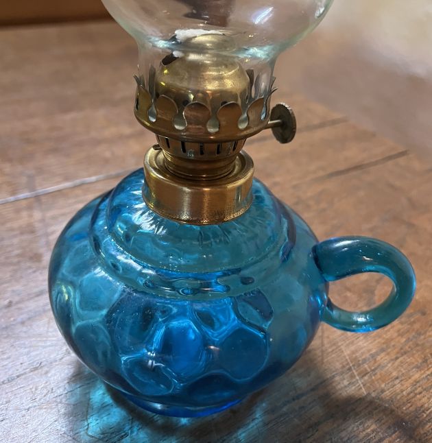 English Blue finger lamp with dimple glass font, new burner and wick with original glass chimney which has an unburst bubble in glass.