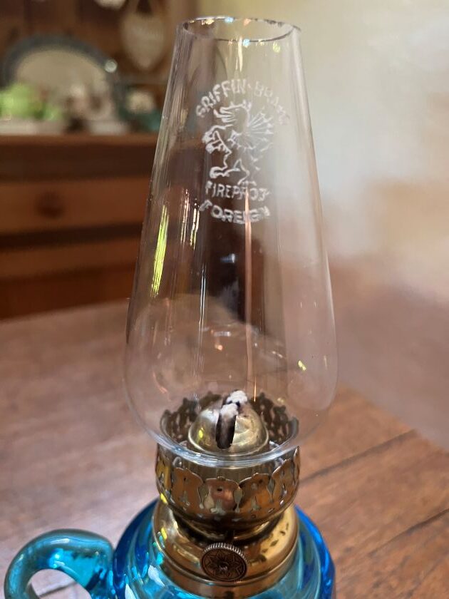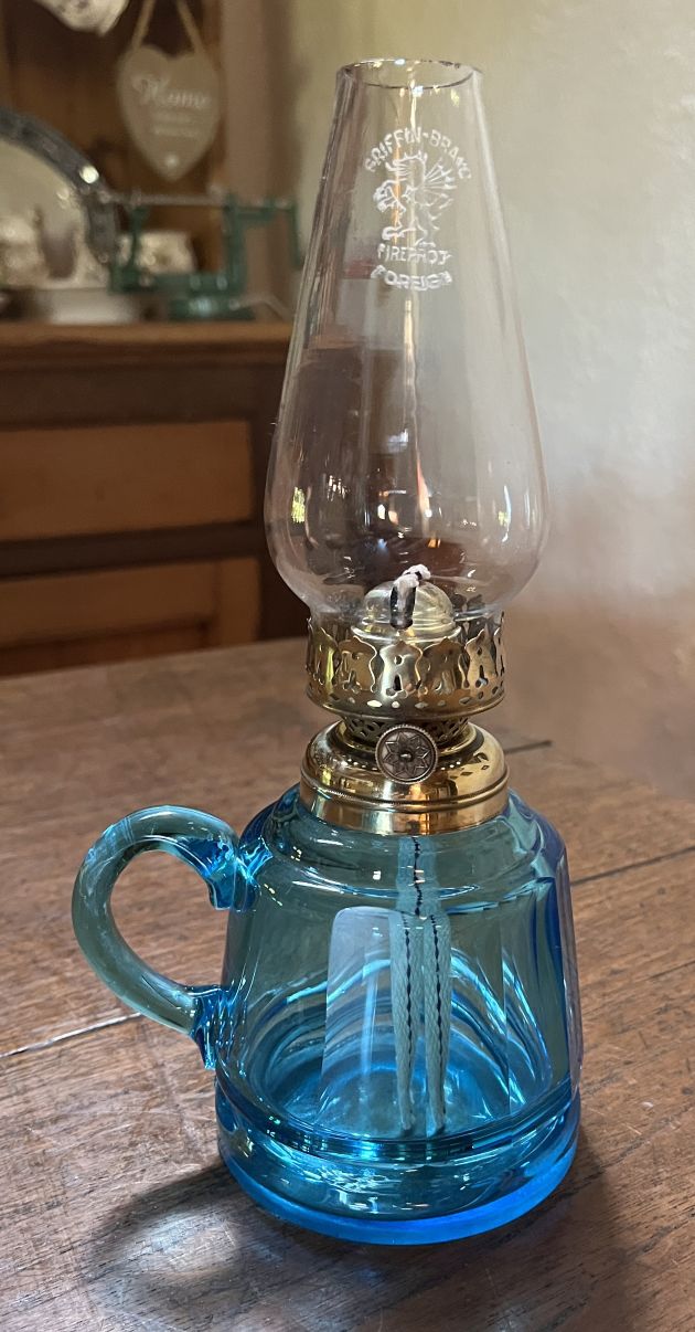 English Blue glass finger lamp with facet cut font, Hornet burner, new wick and marked Griffin Brand chimney.