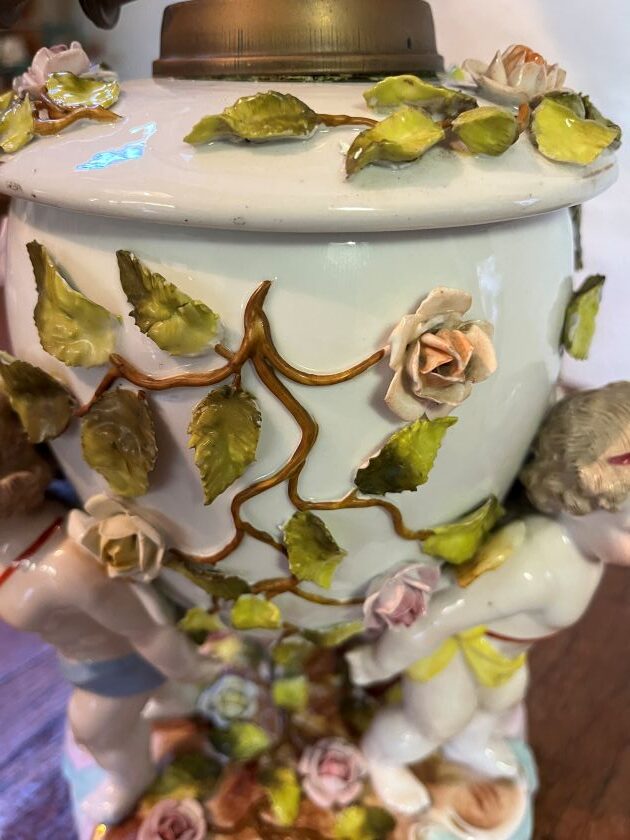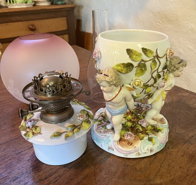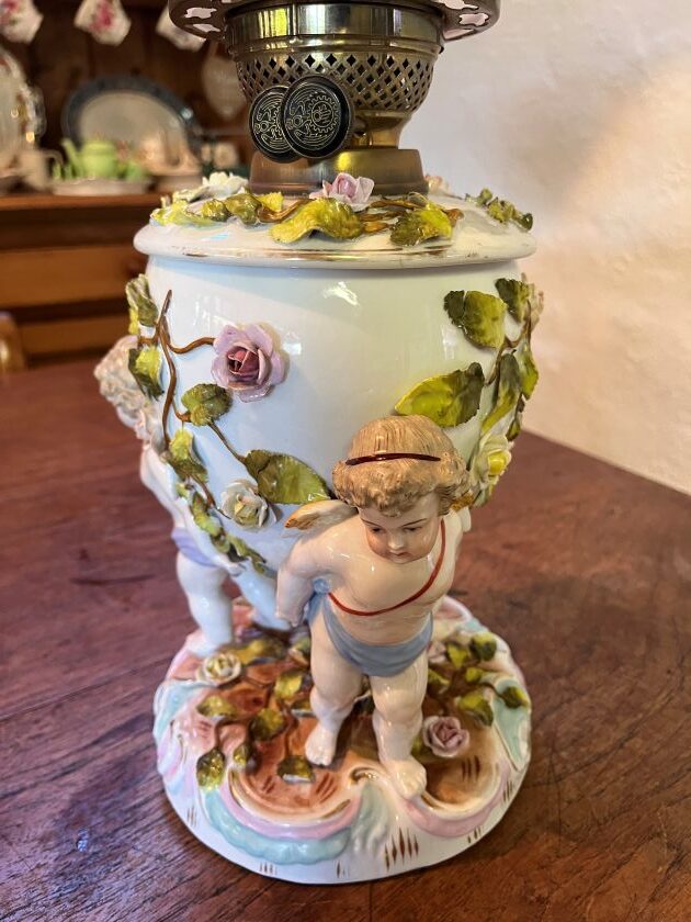 German Sitzendorf Cherub table oil lamp, trademark on base was used between 1887 -1900