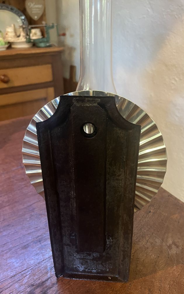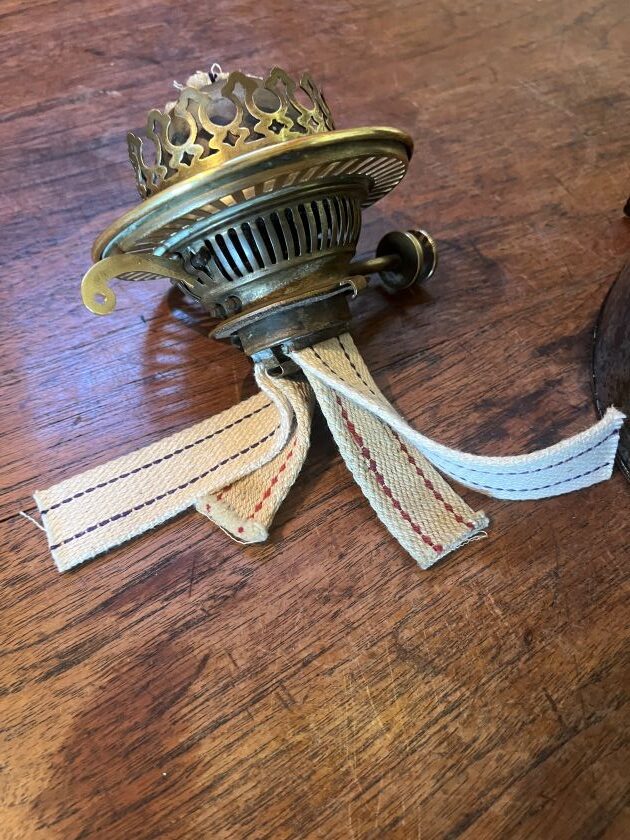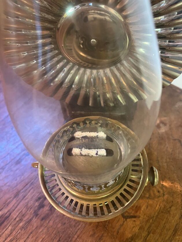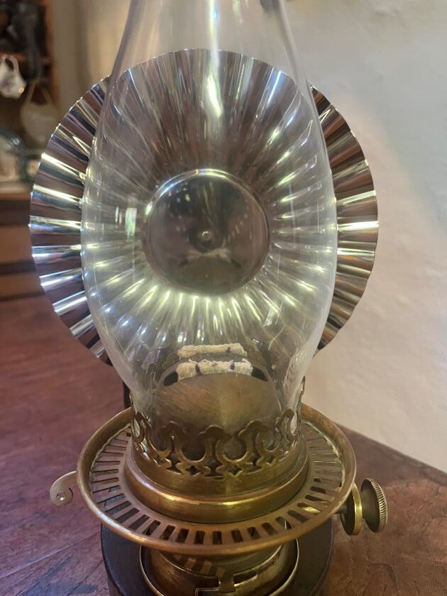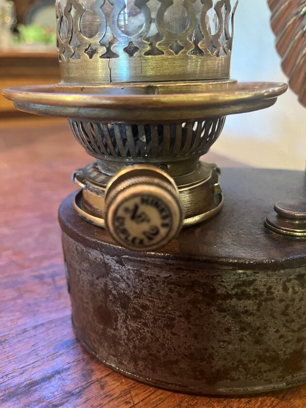 Has remnants of original paint and has been lacquered to preserve finish, new reflector, duplex chimney and double duplex wicks.