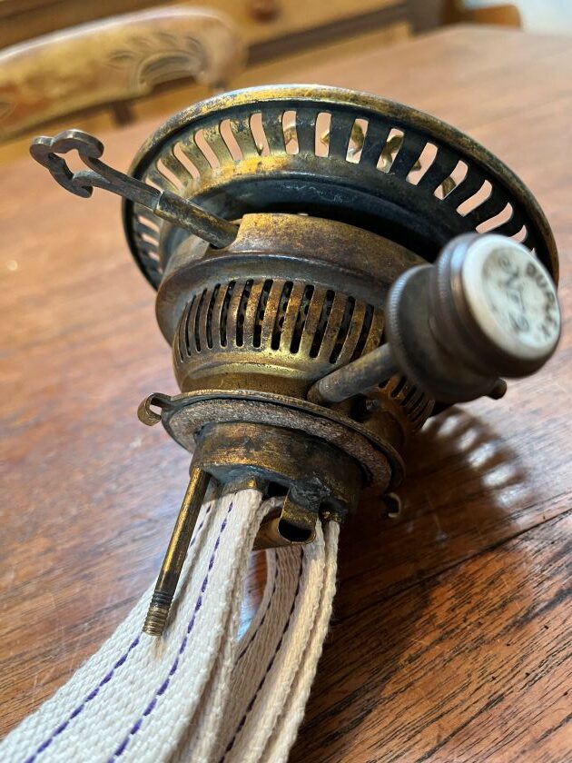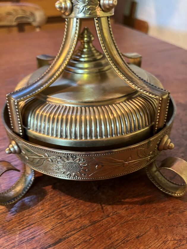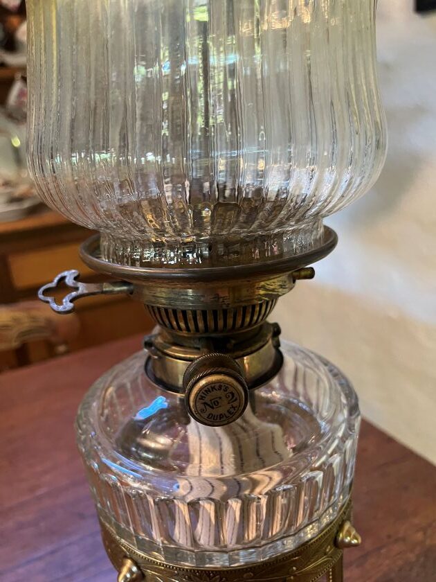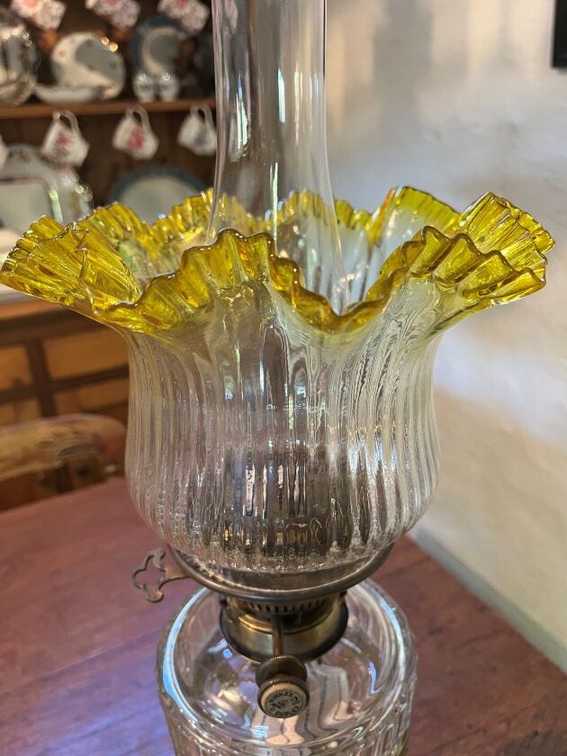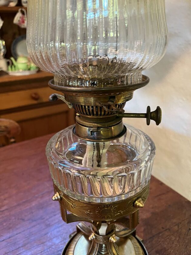 Hinks duplex rise and fall burner, original ribbed yellow tipped tulip glass shade and ‘Fireproof’ marked original chimney and new wicks.
