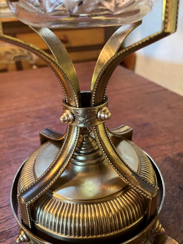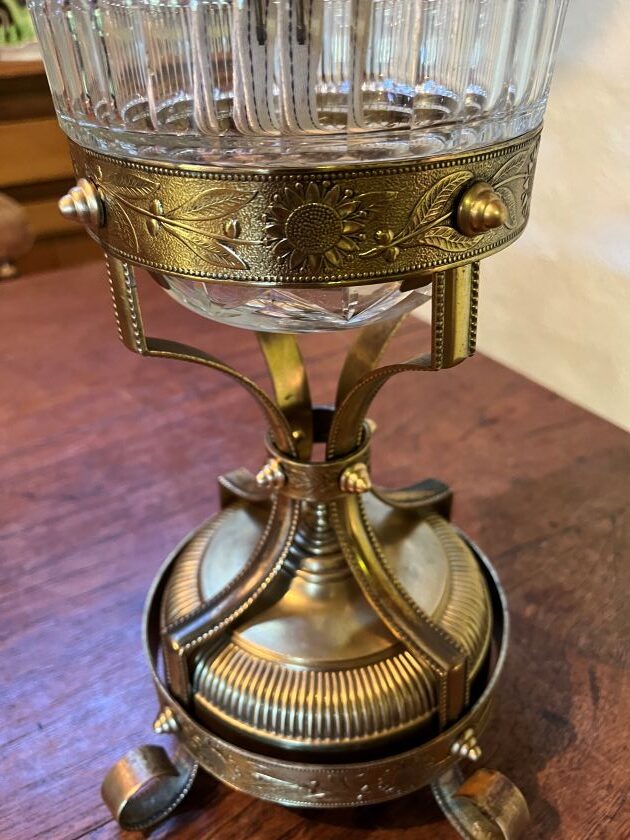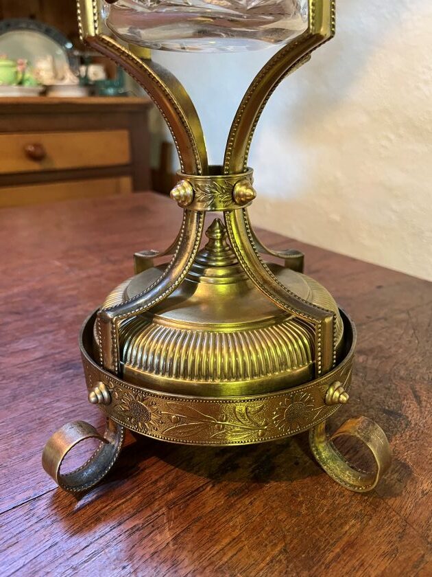 Brass plate is marked ‘Hinks’ has a beautiful drop in crystal cut glass font with bayonet collar. The font drops into the brass carrier.