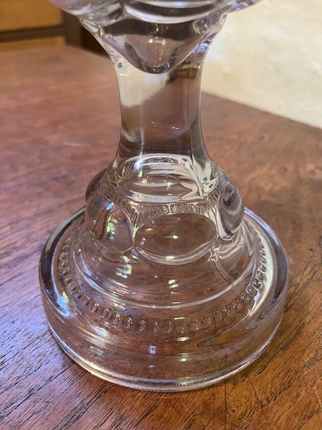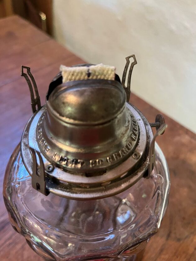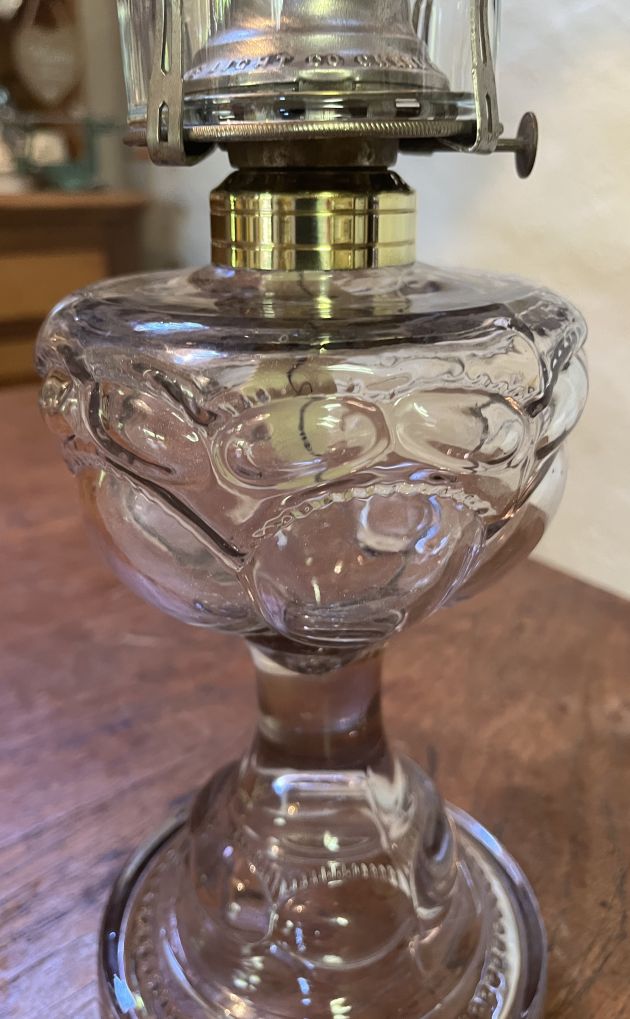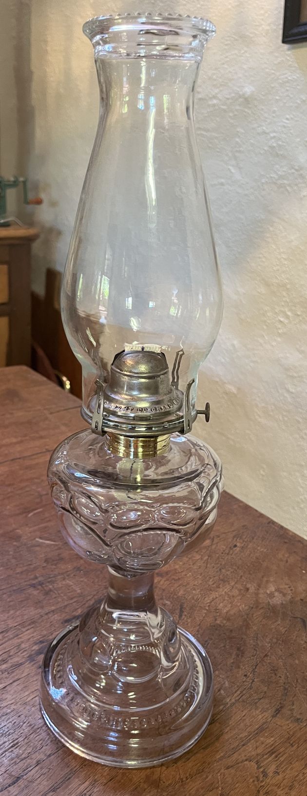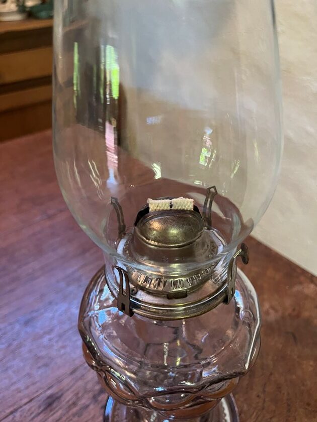 Has a 3″ beaded top glass chimney to match beading on base of lamp and new wick.