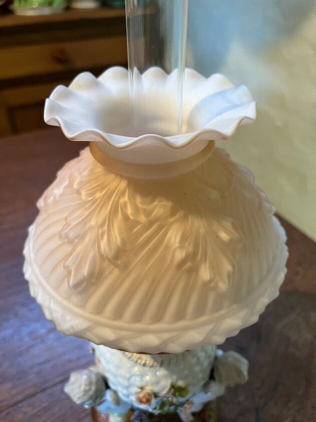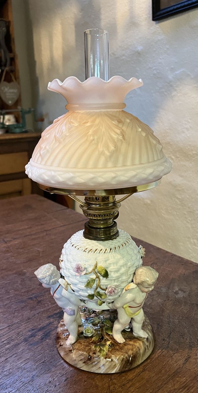 The lamp has three putti/cherubs supporting applied flowers on a basketweave porcelain font with an Acanthus embossed flush pink vintage glass shade.
