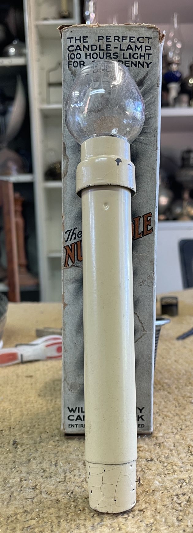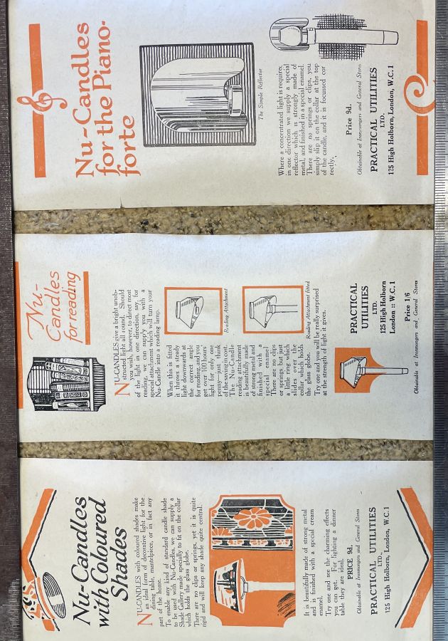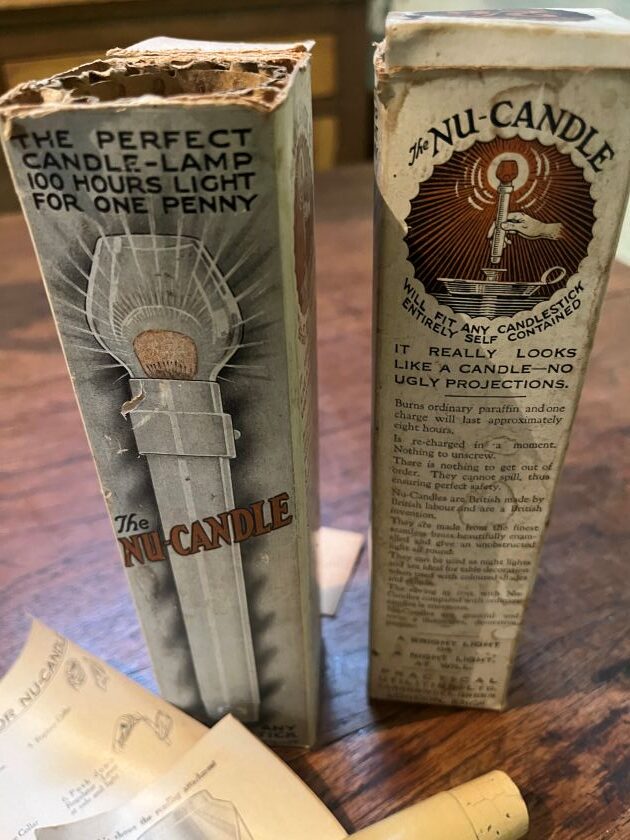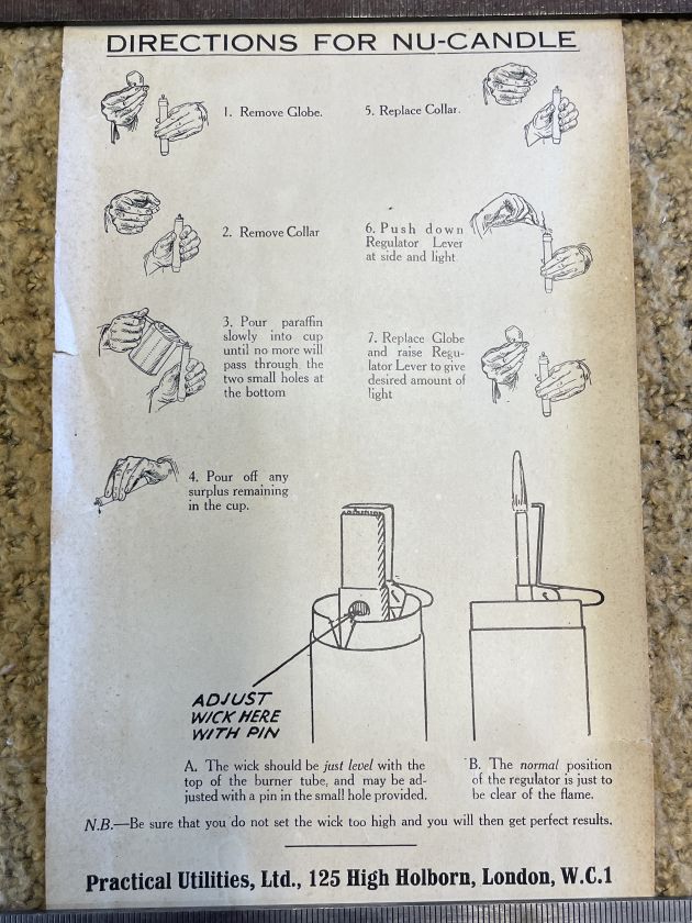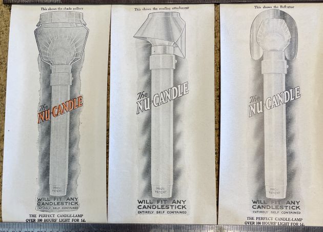 “The Nu-Candle was the safest, cleanest, simple and cheapest light ever invented. The flame is enclosed and there is no flicker, no smoke, no smell and no danger of fire, with one ingenious little control to regulate the flame from a mere glimmer to a strong light. The Nu-Candle is made from finest seamless brass beautifully enamalled and give an unobstructed light all round and can be fitted to any candle holder.”