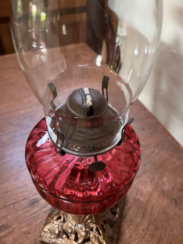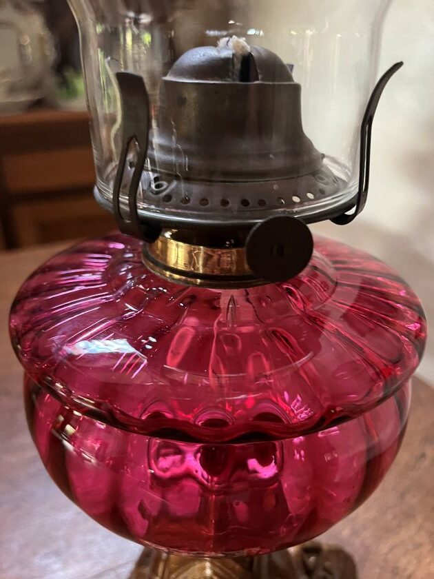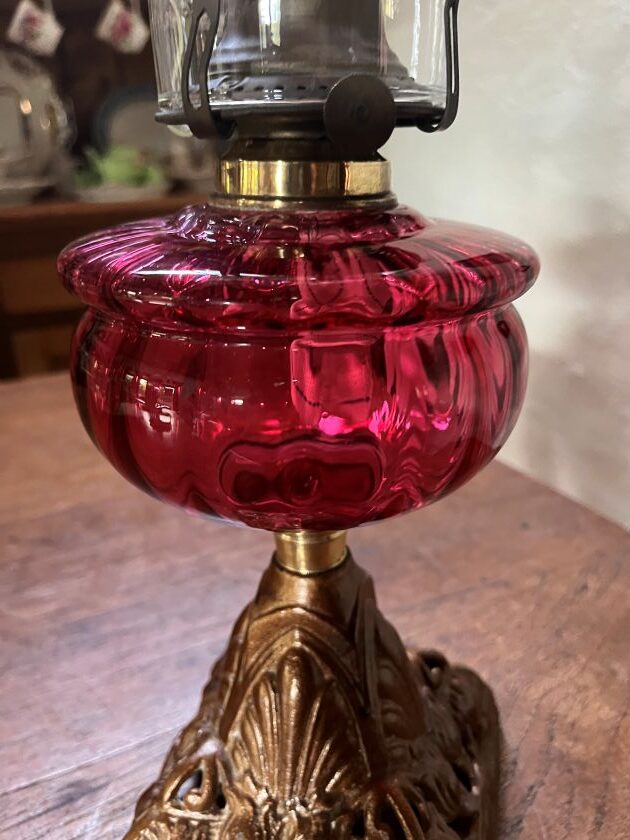 Victorian Cranberry ribbed glass font oil lamp with an old original USA burner.