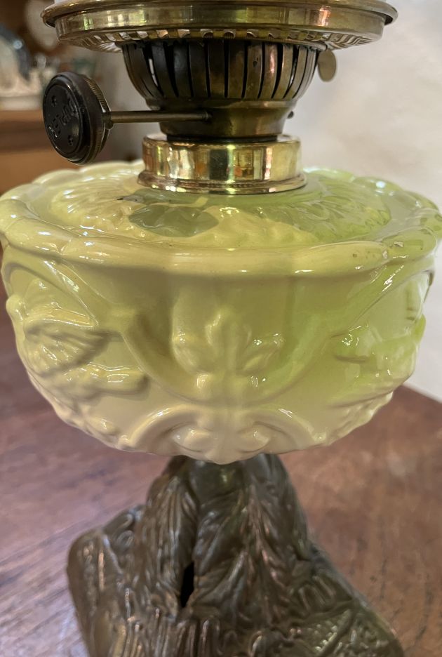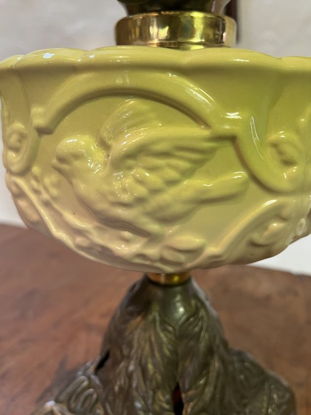 Victorian table oil lamp with an unusual porcelain white font glazed with lime green and embossed showing birds in flight.
