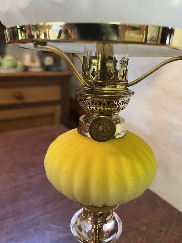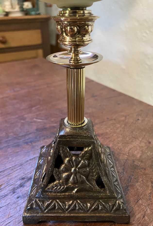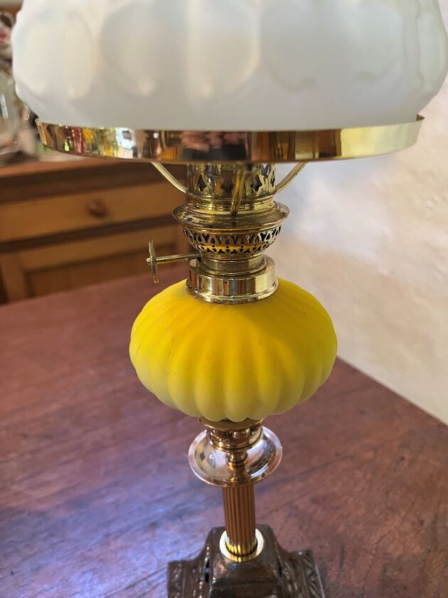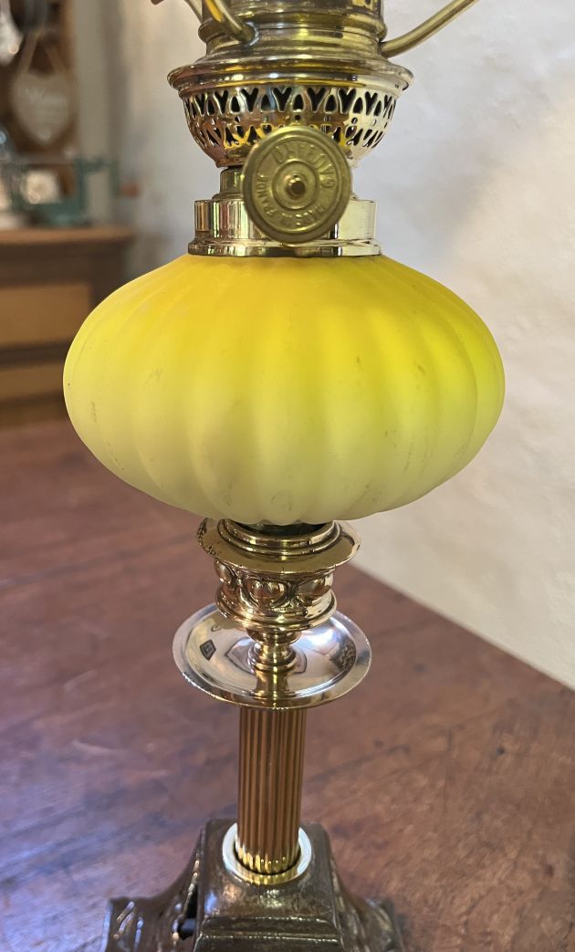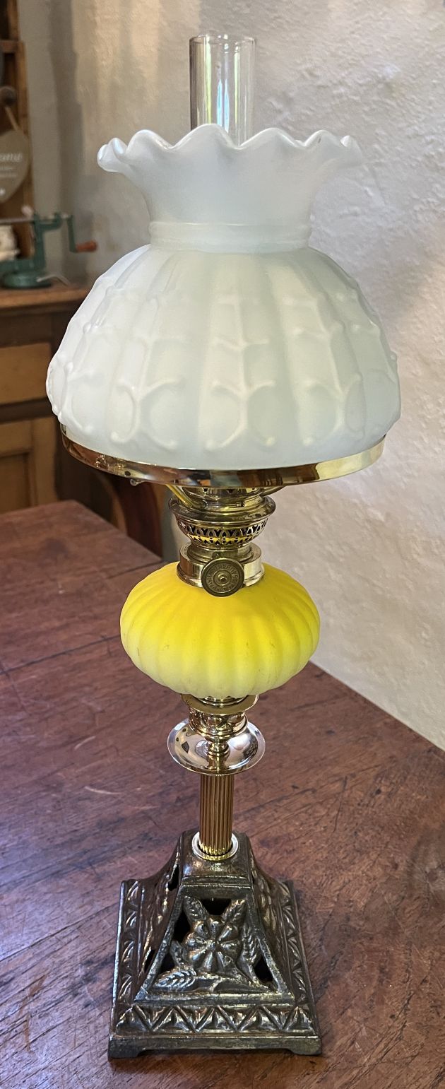 Yellow Peg Candlestick Oil Lamp with a ribbed matt peg font c1900 has similar cast iron base depicting flowers. Brass reeded column supporting brass candle stick holder. New quality Gaudard 6”’ (ligne) burner with shade ring, carrying a repro pattern shade, new Kosmos chimney and wick.