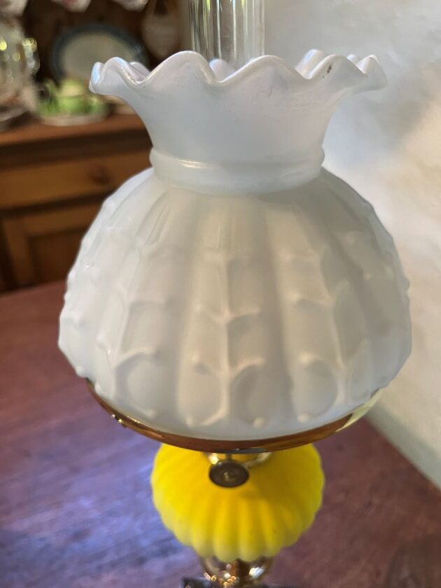Yellow Peg Candlestick holder Oil Lamp, ribbed peg font, similar cast iron base. Brass reeded column supporting brass candle stick holder. New quality Gaudard 6”’ (ligne) burner with shade ring, repro shade, new chimney & wick.